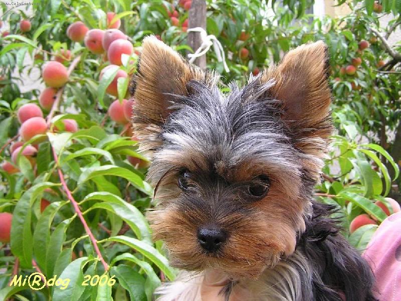 Těšíte se na broskvičky?-štěně yorkšírského teriéra v detailu s pozadím plodů broskví