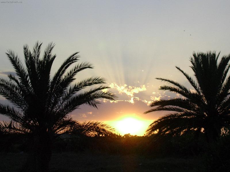 Zápas slunce-na fotce je zobrazen zapad slunce nezi palmami