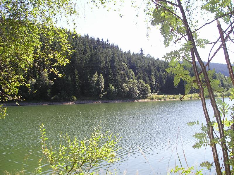 Přehradní nádrž Šance-Vodní hladina přehrady s okolními lesy